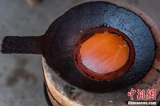 把苗族用来画蜡的黄蜡放在特定的铁质容器里升温,达到所需要的温度后使黄蜡融化。魏廷华 摄