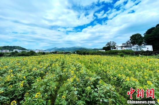 2021年6月7日,古田镇五龙村田地里的向日葵花竞相开放,金色的花海成为一景。近年来,古田立足良好的生态环境和“村在景区中、景点在村中”的实际,发展全域旅游,推动乡村振兴。 中新社记者 张斌 摄