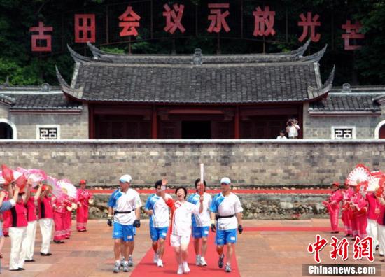 2008年5月13日,北京奥运会圣火在福建省龙岩市上杭县古田镇传递。 中新社记者 王东明 摄
