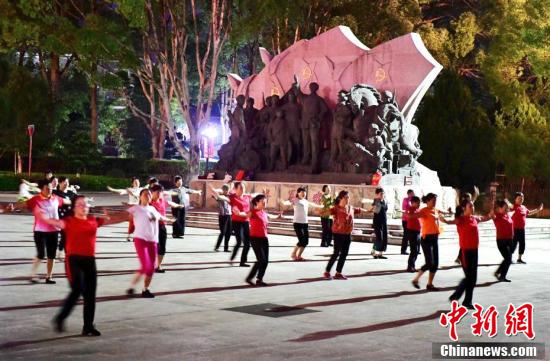 2021年6月6日晚,在古田镇古田会议纪念馆前的广场上,居民在跳舞健身。 中新社记者 张斌 摄