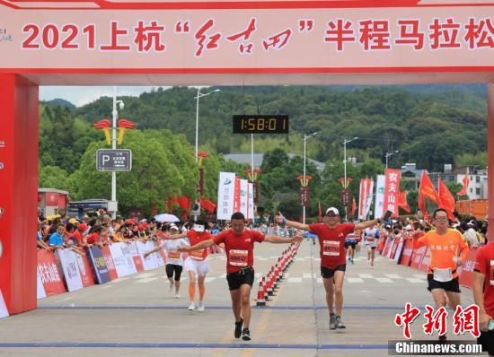 2021年5月16日,2021上杭“红古田”半程马拉松赛在福建省龙岩市上杭县古田镇开赛。 中新社发 林斯乾 摄