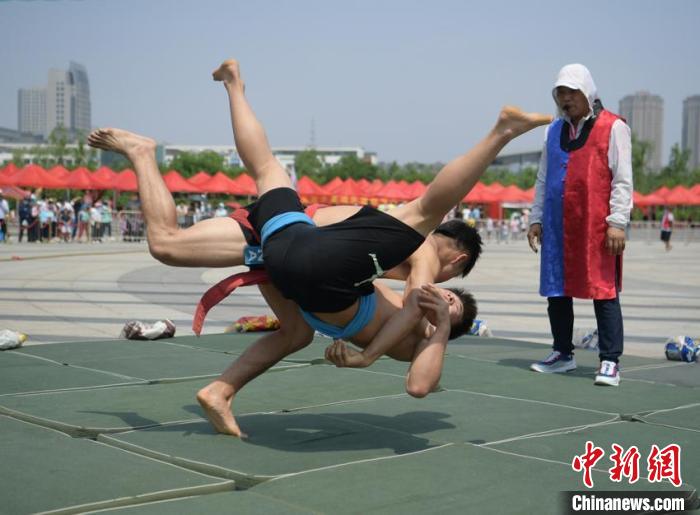 朝鲜族青年为市民表演朝鲜族摔跤。 张瑶 摄