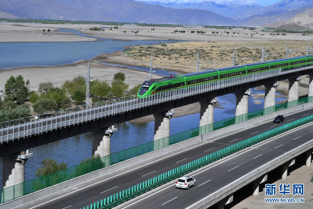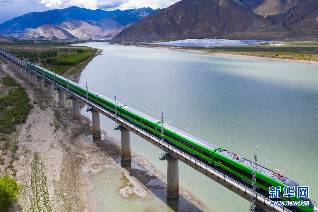 试运行的复兴号列车行驶在雅鲁藏布江畔(6月16日摄)。
