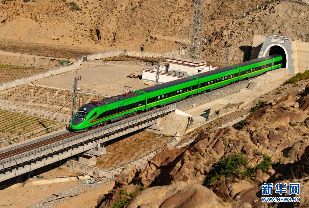 试运行的复兴号列车驶出拉林铁路的嘎拉山隧道(6月16日摄)。