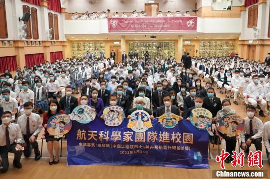 6月25日上午,中国工程院院士、神舟飞船首任总设计师戚发轫走进香港百年名校皇仁书院,向香港中学生代表畅谈中国航天与航天精神。图为航天科学家团队成员与广大师生大合照。 中新社记者 张炜 摄