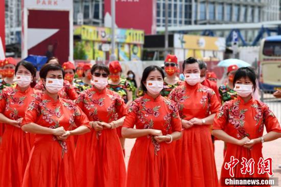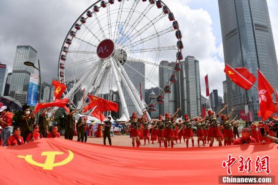 7月1日下午,有香港市民及“香港情·中国心” 团体于中环码头与现场市民载歌载舞庆祝中国共产党成立100周年和香港回归祖国24周年。图为表演者进行舞蹈表演。 中新社记者 李志华 摄