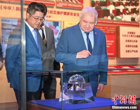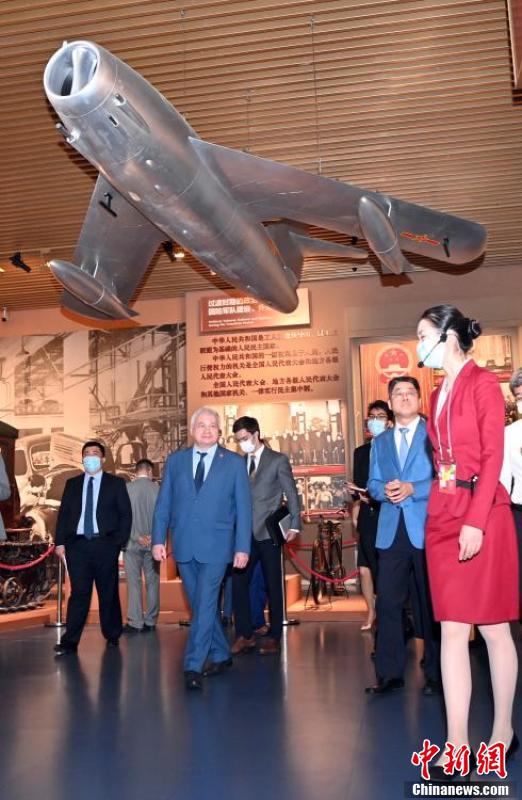 图为杰尼索夫(左二)参观展览。 中新社记者 侯宇 摄