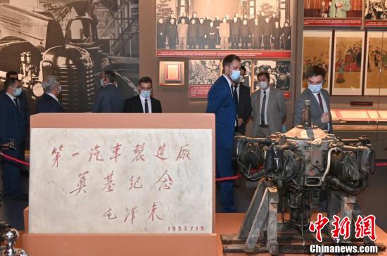 图为参观期间杰尼索夫(前左)与乐玉成交流。 中新社记者 侯宇 摄