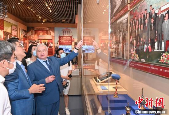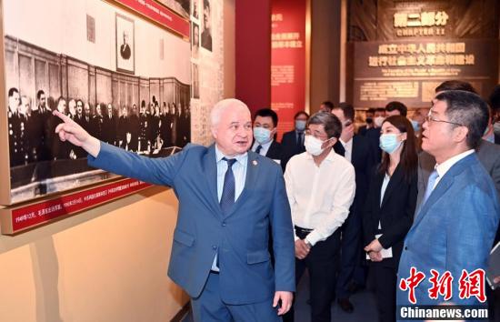 7月5日上午,俄罗斯驻华大使杰尼索夫率大使馆馆员等前往北京的中国共产党历史展览馆,参观“‘不忘初心、牢记使命’中国共产党历史展览”。中国外交部副部长乐玉成一同参观。图为杰尼索夫(左三)亲自介绍展览图片中与自己相关的内容。 中新社记者 侯宇 摄