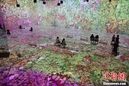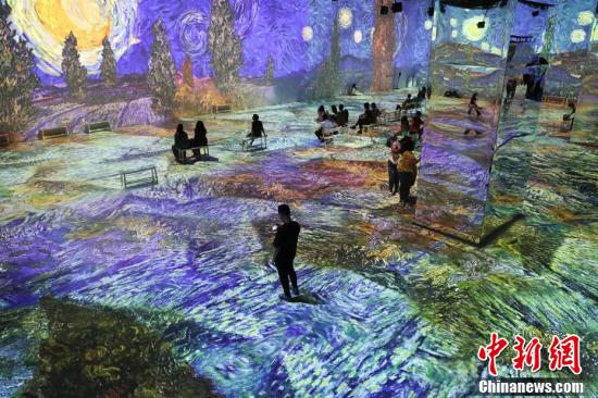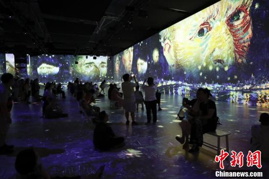 当地时间7月5日,观众在纽约曼哈顿观赏沉浸式梵高展。该展在巨型展览空间内用数十台投影机将画家梵高的作品转化为动态数字影像,通过空间影像、现场装置和音乐等唤起参观者的情感和内心意识。 中新社记者 廖攀 摄