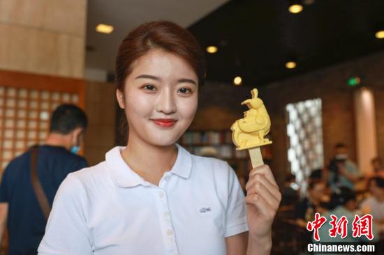7月6日,山西太原,一名女子展示“鸟尊”雪糕(模型)。当日,山西博物院发布“鸟尊”雪糕。 中新社记者 张云 摄