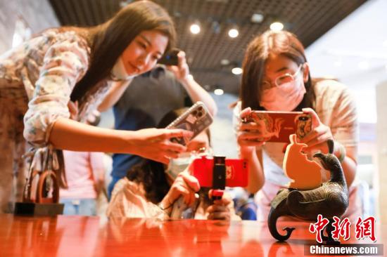 7月6日,山西太原,市民拍摄“鸟尊”雪糕(模型)与青铜器(模型)合影。当日,山西博物院发布“鸟尊”雪糕。 中新社记者 张云 摄