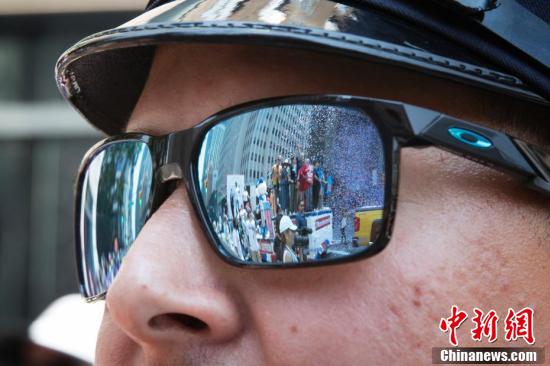 当地时间7月7日,一名现场警察所戴的太阳镜中映出游行队伍。当日,“纸带游行”在美国纽约曼哈顿举行,致敬抗疫工作者。在活动现场,人们将办公室碎纸机中的纸带抛向游行队伍表达敬意。 中新社记者 廖攀 摄