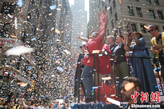 当地时间7月7日,纽约市市长白思豪(左三)与抗疫工作者同乘彩车参加游行。当日,“纸带游行”在美国纽约曼哈顿举行,致敬抗疫工作者。在活动现场,人们将办公室碎纸机中的纸带抛向游行队伍表达敬意。 中新社记者 廖攀 摄