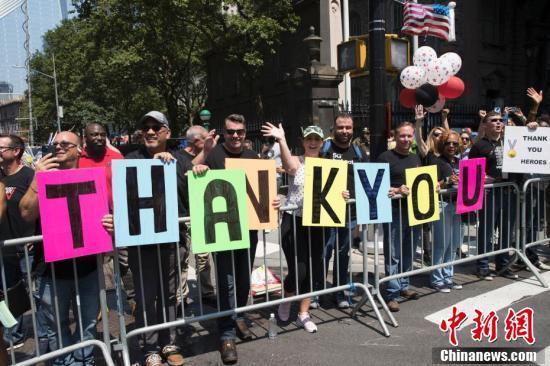 当地时间7月7日,纽约观看游行的民众向抗疫工作者打出“感谢”标语。当日,“纸带游行”在美国纽约曼哈顿举行,致敬抗疫工作者。 中新社记者 廖攀 摄