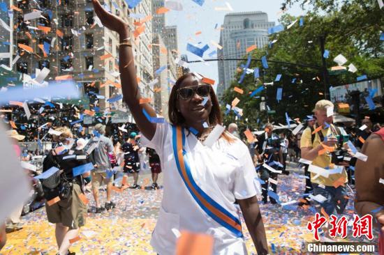当地时间7月7日,美国首位接种新冠疫苗的纽约护士桑德拉·林赛领衔游行队伍。当日,“纸带游行”在美国纽约曼哈顿举行,致敬抗疫工作者。在活动现场,人们将办公室碎纸机中的纸带抛向游行队伍表达敬意。 中新社记者 廖攀 摄