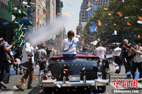当地时间7月7日,美国首位接种新冠疫苗的纽约护士桑德拉·林赛乘坐敞篷车领衔游行队伍。当日,“纸带游行”在美国纽约曼哈顿举行,致敬抗疫工作者。在活动现场,人们将办公室碎纸机中的纸带抛向游行队伍表达敬意。 中新社记者 廖攀 摄