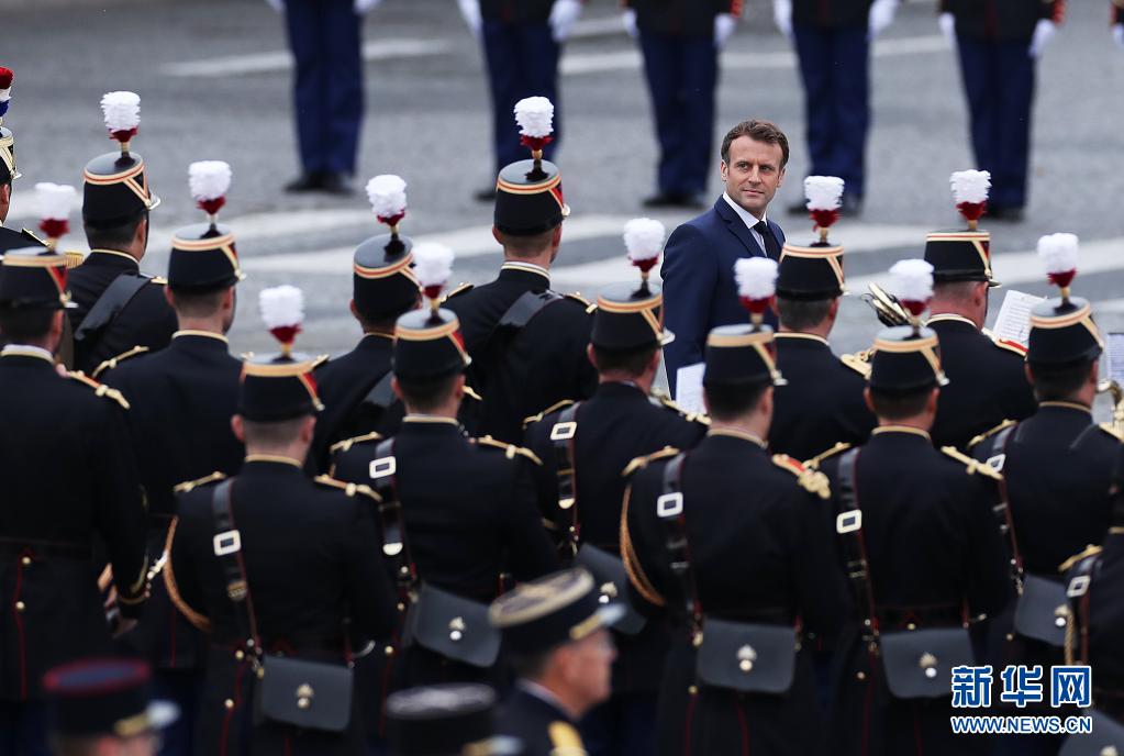 7月14日,法国总统马克龙在巴黎协和广场国庆阅兵式现场检阅队伍。