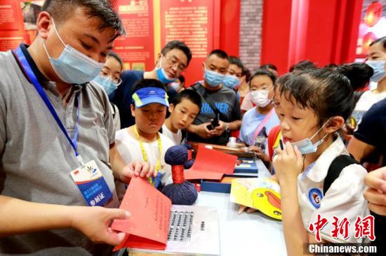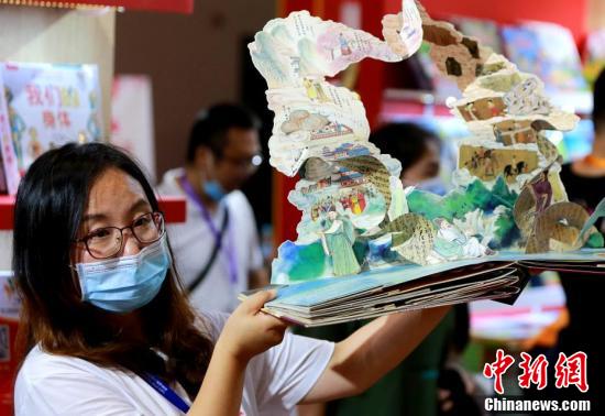 7月15日,第30届全国图书交易博览会在山东济南开幕,展出优秀出版物和文创产品40多万种。图为参展商在展会上展示折叠书。 中新社记者 梁犇 摄
