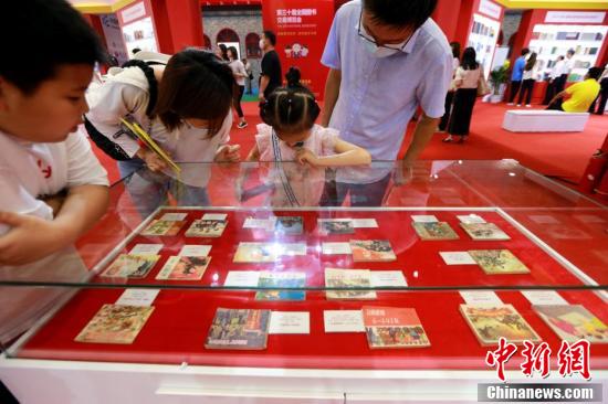 7月15日,第30届全国图书交易博览会在山东济南开幕,展出优秀出版物和文创产品40多万种。图为庆祝建党100周年主题展暨全国出版物精品展中展出的连环画吸引众多读者。 中新社记者 梁犇 摄
