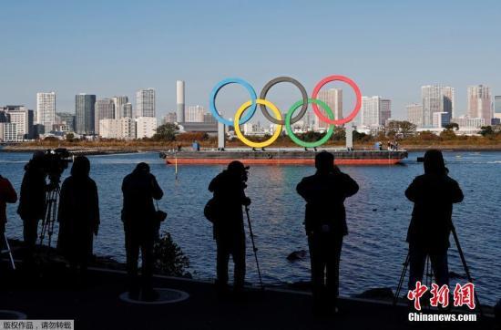 2020年12月1日,日本东京,正在用船运输的奥运五环标志,时隔4个月的安全检查和维修后,它重新回到东京湾上。