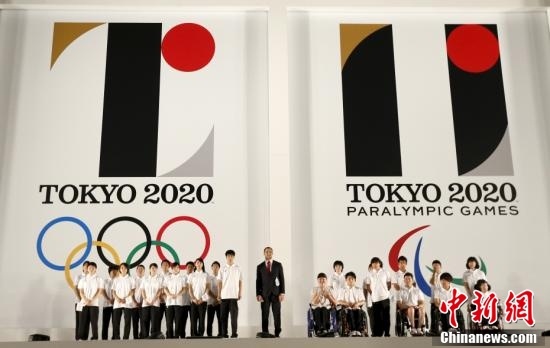 2015年7月24日,在东京都政府大楼举行的揭幕活动中,运动员站在原2020年东京奥运会和残奥会会徽前。后来,此会徽因涉嫌抄袭而被撤销。