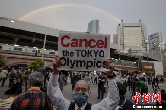 2021年5月7日,日本市民在东京街头抗议,呼吁取消东京奥运会。据报道,奥运会开幕在即,日本民调显示仍有大约60%的受访者希望取消或再次推迟奥运会。