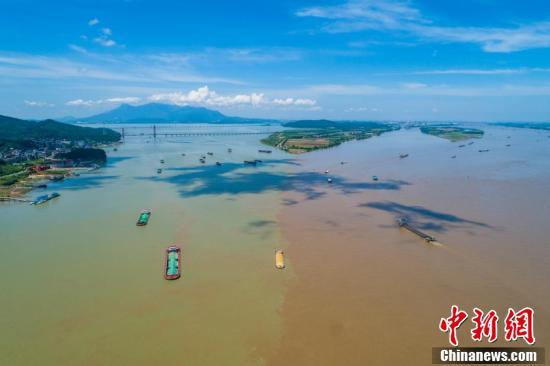大暑时节,在长江与鄱阳湖交汇处,“江湖两色”景致蔚为壮观。连日持续晴热天气,长江及鄱阳湖正处丰水期,江湖汇合处,水线清浊分明。 李学华 摄