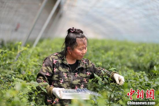 2021年6月,在丹东市振安区汤山城镇,工作人员在蓝莓大棚采摘蓝莓。近年来,丹东市大力实施蓝莓产业发展战略,推进蓝莓全产业链发展,打造“丹东蓝莓”靓丽名片。丹东已成为领军全国的主要蓝莓生产基地。 中新社记者 于海洋 摄