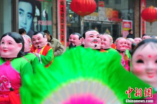 2013年2月,在丹东步行街上,由数百人组成的秧歌队热情献演,吸引了众多市民的观看。 中新社记者 于海洋 摄