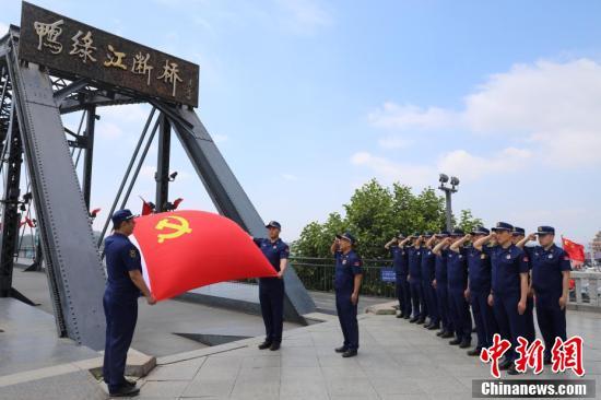 2021年6月,丹东市消防救援支队振兴大队组织全体党员来到丹东鸭绿江断桥参观学习,重温入党誓词,追忆革命先烈不畏艰险、舍生忘死、保家卫国的革命精神。鸭绿江断桥是原鸭绿江大桥被炸毁后的残余部分,是抗美援朝沧桑历史的见证者。2016年12月,鸭绿江断桥入选《全国红色旅游景点景区名录》。 中新社记者 于海洋 摄