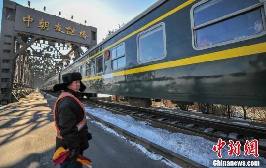 2019年2月,巡守员李民按标准进行接车。与鸭绿江断桥毗邻的中朝友谊桥是连接中国辽宁丹东和朝鲜新义州陆路口岸的重要通道。中国铁路沈阳局集团有限公司丹东工务段在中朝友谊桥设立一个由三人组成的江桥巡守作业组,每天24小时不间断地对大桥进行巡检。 中新社记者 于海洋 摄
