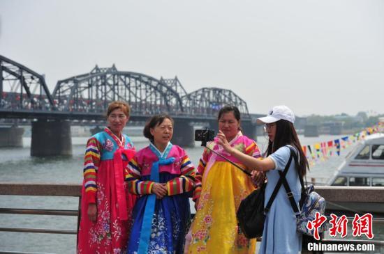 2019年5月,游客在鸭绿江畔拍照。“五一”假期,辽宁丹东迎来了大量游客,鸭绿江边游人如织。 中新社记者 于海洋 摄