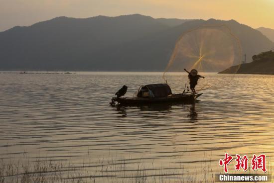 2021年6月,丹东市宽甸满族自治县振江镇绿江村,渔民在江中撒网。 中新社记者 于海洋 摄
