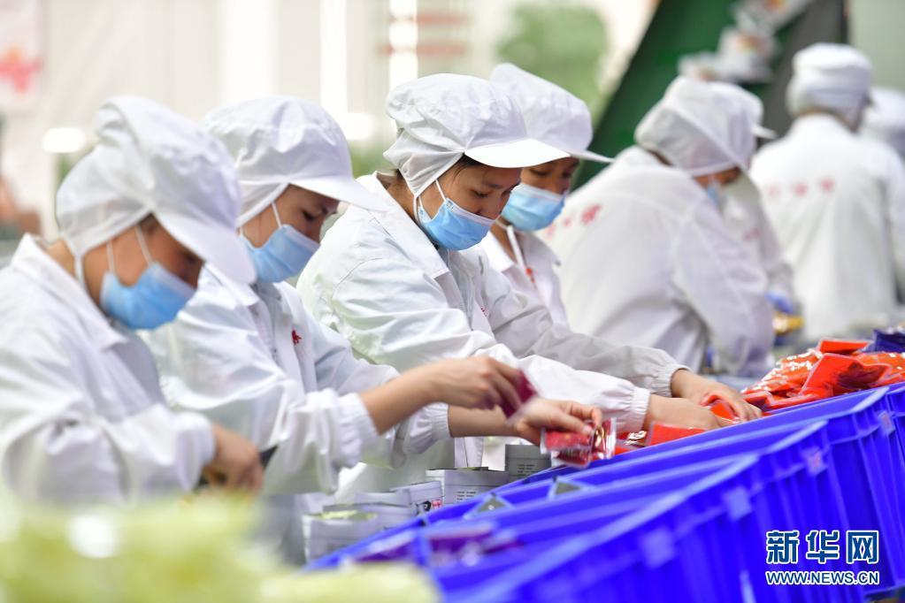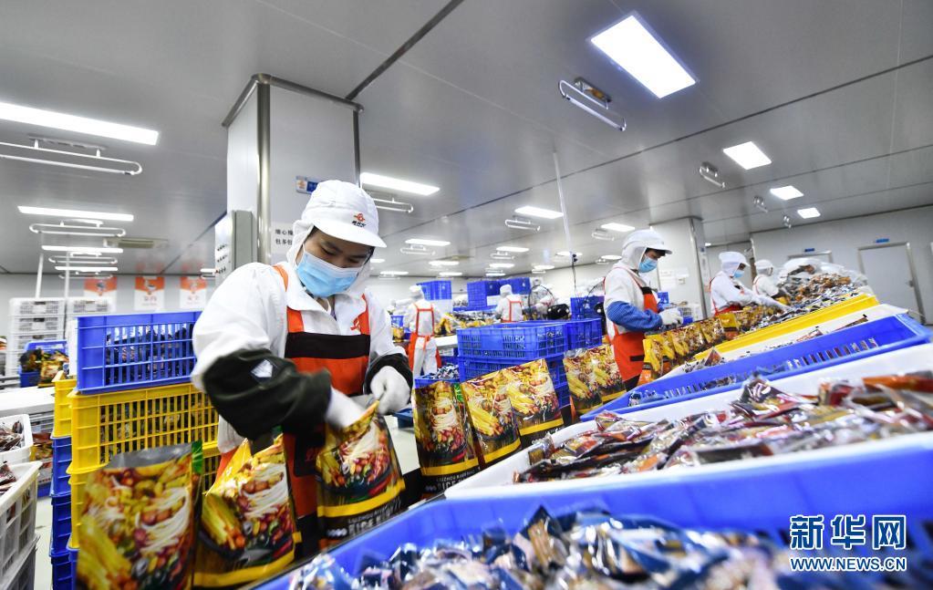 工人在广西螺状元食品科技股份有限公司螺蛳粉生产车间生产线上包装螺蛳粉(6月5日摄)。