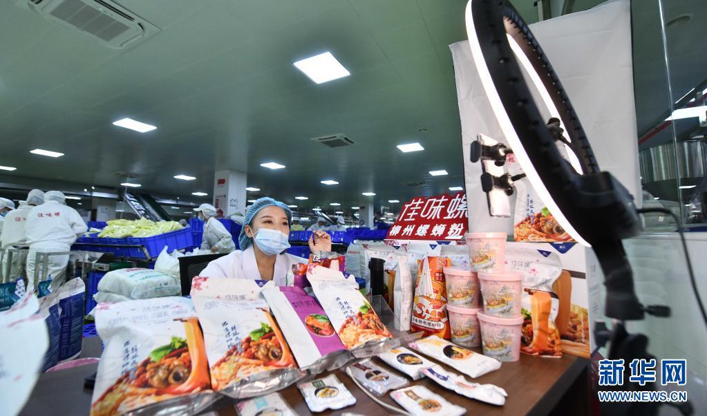 在广西善元食品有限公司螺蛳粉生产车间,工作人员在直播销售螺蛳粉(8月17日摄)。