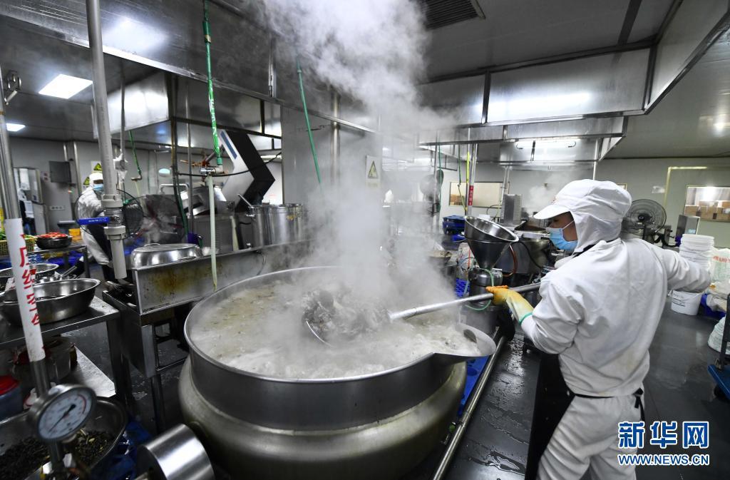 工人在广西螺状元食品科技股份有限公司螺蛳粉生产车间熬制螺蛳汤(6月5日摄)。