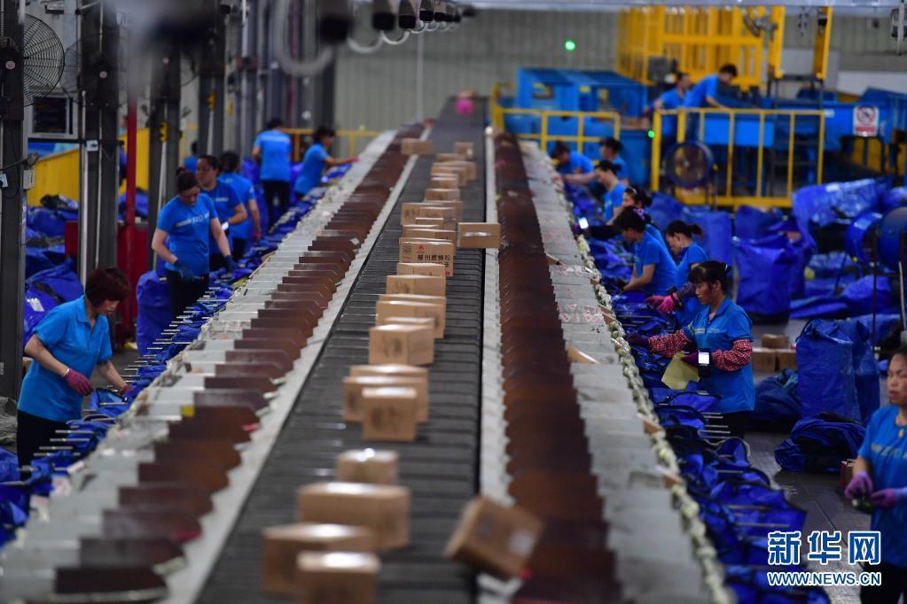 在中通快递广西柳州转运中心,员工对螺蛳粉快件进行分拣(6月17日摄)。
