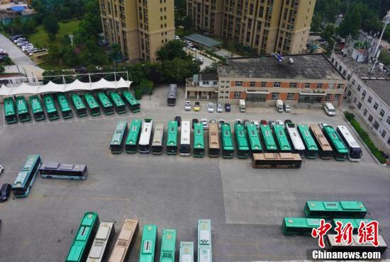 8月22日,郑州市停运公交车辆在一公交公司内停放。据悉,为有效应对暴雨天气,8月22日、23日,郑州公交线路全部停止运营。 中新社记者 刘鹏 摄