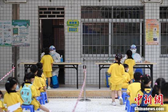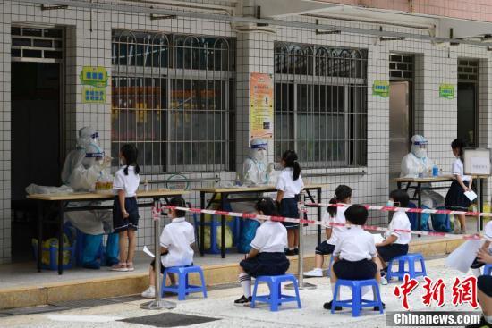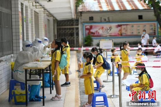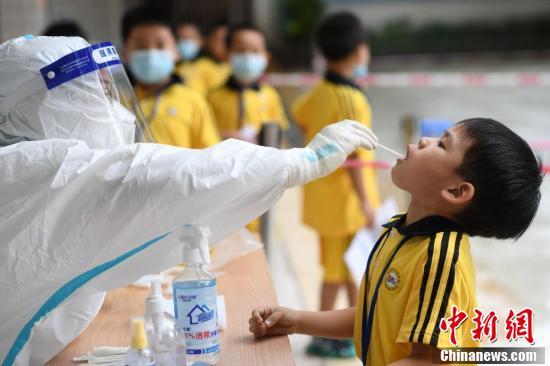 8月28日,学生在广东省广州市越秀区育才学校做核酸检测。为进一步做好中小学、幼儿园秋季学期开学新冠肺炎疫情防控工作,广州多区开展全体师生员工核酸检测。 中新社记者 陈楚红 摄