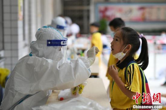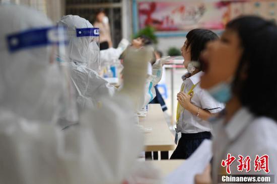 8月28日,医护人员在广东省广州市越秀区育才学校为学生做核酸检测。为进一步做好中小学、幼儿园秋季学期开学新冠肺炎疫情防控工作,广州多区开展全体师生员工核酸检测。 中新社记者 陈楚红 摄