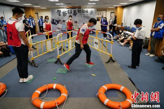 8月29日,为招募见习督察及警员,香港警务处在香港警察学院举办“警察招募·体验日”活动。千余名有志报考警队的人士参加活动,体验遴选程序,了解警察学院训练课程和警队不同部门的职能和装备。警方称,香港警队在2021年至2022年的目标是招募195名见习督察和1345名警员。图为报考人士体验警察学院训练课程。 中新社记者 张炜 摄