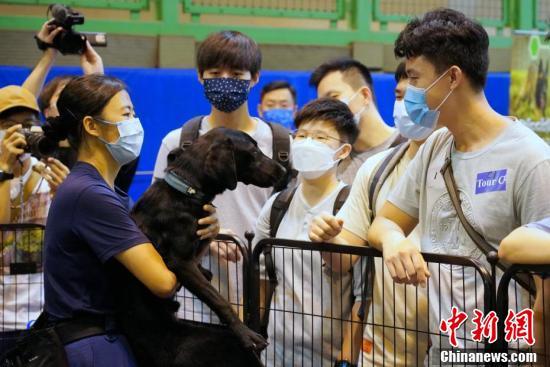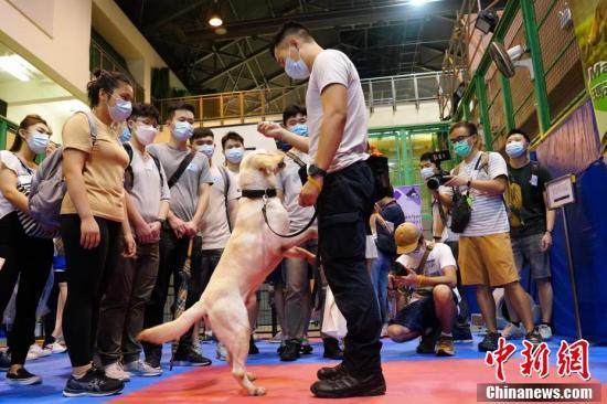 8月29日,为招募见习督察及警员,香港警务处在香港警察学院举办“警察招募·体验日”活动。千余名有志报考警队的人士参加活动,体验遴选程序,了解警察学院训练课程和警队不同部门的职能和装备。警方称,香港警队在2021年至2022年的目标是招募195名见习督察和1345名警员。图为警犬队警员向报考人士介绍缉毒犬。 中新社记者 张炜 摄