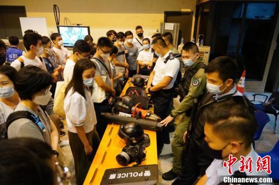 8月29日,为招募见习督察及警员,香港警务处在香港警察学院举办“警察招募·体验日”活动。千余名有志报考警队的人士参加活动,体验遴选程序,了解警察学院训练课程和警队不同部门的职能和装备。警方称,香港警队在2021年至2022年的目标是招募195名见习督察和1345名警员。图为香港警方执行机动性巡逻、处理突发事件等任务的冲锋队警员介绍装备。 中新社记者 张炜 摄