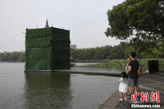 9月3日,浙江杭州,被施工帷幕包围起来集贤亭引游客驻足。近日,杭州西湖边著名景点——集贤亭正式进入全面封闭维修阶段,据现场施工人员介绍,此次维修为外观修缮更新,整个工程大约持续至9月底。 中新社记者 许少峰 摄