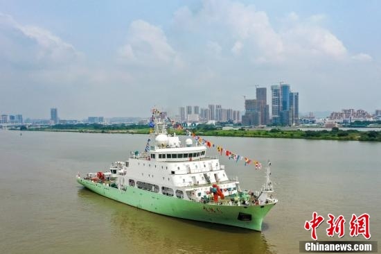 9月6日,中国科学院南海海洋研究所“实验6”综合科学考察船从广东省广州市新洲码头起锚,开始它的首次航行。此次首航将赴珠江口-南海北部海域执行多学科综合观测重要科学任务,为揭示粤港澳大湾区生态安全调控机理、涡旋多尺度动力过程与环境效应等重大科学问题提供强化观测支持。图为“实验6”综合科学考察船在珠江航行。(无人机照片) 中新社记者 陈骥旻 摄