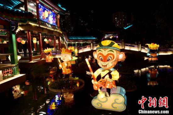 9月6日,为迎接中秋佳节及庆祝黄大仙宝诞,香港啬色园黄大仙祠将于中秋节前后举办花灯庙会等多项活动与民同乐。图为湖上有《西游记》角色造型花灯。 中新社记者 李志华 摄