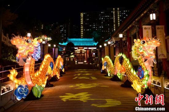 9月6日,为迎接中秋佳节及庆祝黄大仙宝诞,香港啬色园黄大仙祠将于中秋节前后举办花灯庙会等多项活动与民同乐。图为以龙为造型的花灯。 中新社记者 李志华 摄