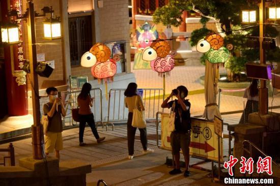 9月6日,为迎接中秋佳节及庆祝黄大仙宝诞,香港啬色园黄大仙祠将于中秋节前后举办花灯庙会等多项活动与民同乐。图为入场人士观赏花灯。 中新社记者 李志华 摄