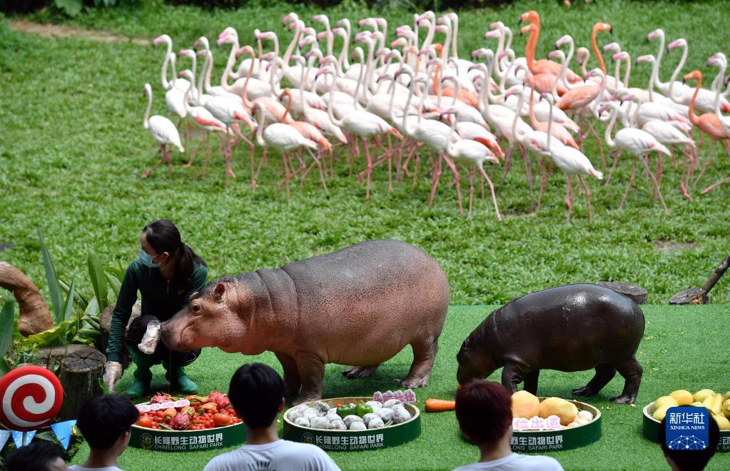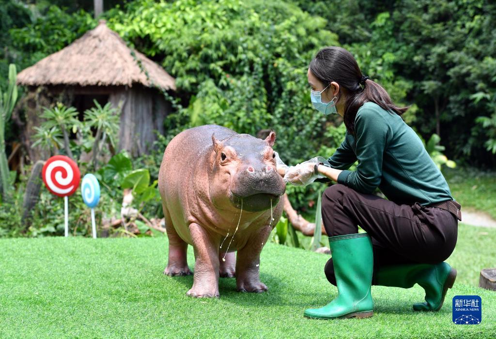 当日,非洲河马菲菲在广州长隆野生动物世界迎来两周岁生日。菲菲是长隆人工育幼长大的雌性河马宝宝,目前体重超过200公斤。
